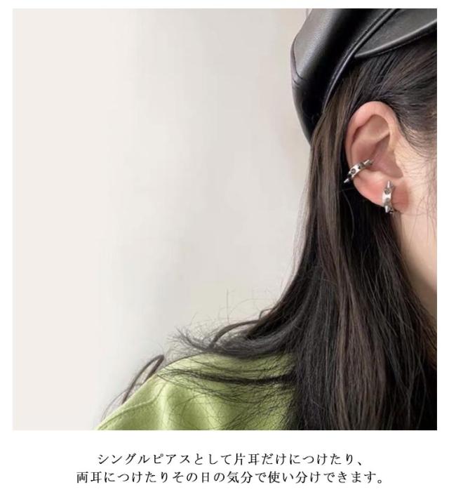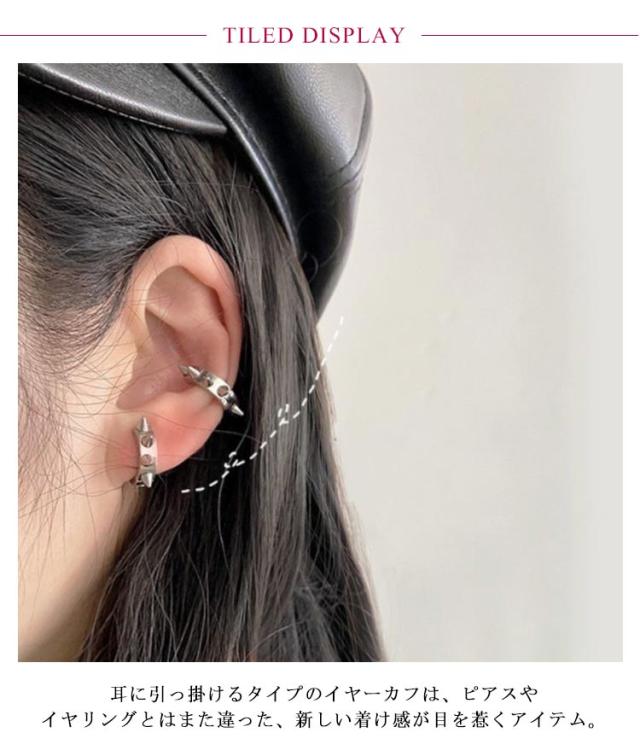 | 穴あけ不要スパイクモチーフのイヤーカフ。【ピアスタイプあり◎】 耳に引っ掛けるタイプのイヤーカフは、ピアスやイヤリングとはまた違った、新しい着け感が目を惹くアイテム。 ピアスホールがない方にも着用していただけます。 シングルピアスとして片耳だけにつけたり、両耳につけたりその日の気分で使い分けできます。 素材はチタンで変色や錆びに強く、アレルギー反応が出にくい点が特徴です。また、硬い金属ですのでお手入れも簡単で、一年中安心してご使用していただけるアクセサリー素材です。 カップルやお友達同士でシェアすると更にお得です。 シンプルなフープピアスはメンズにもレディースにもおススメです。 | |