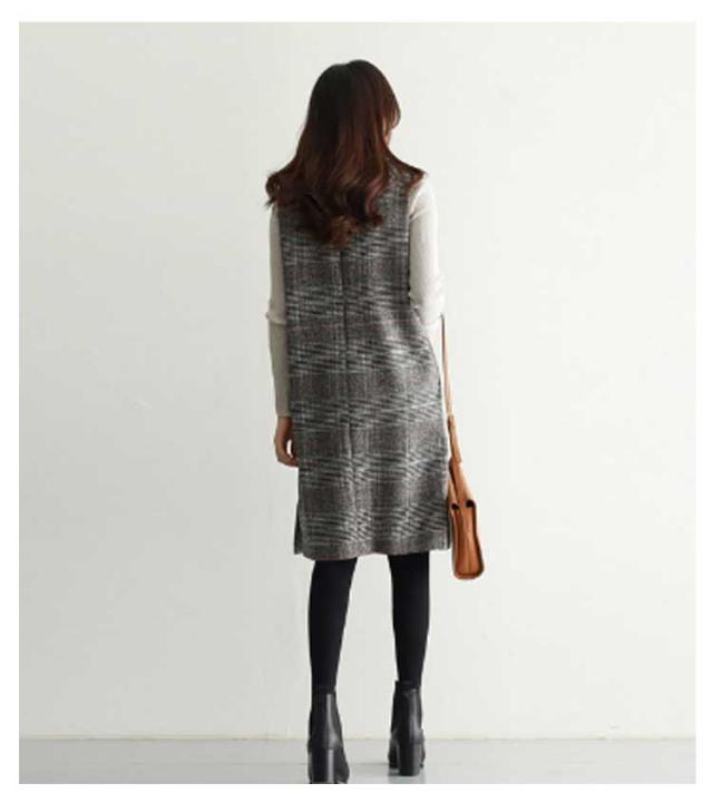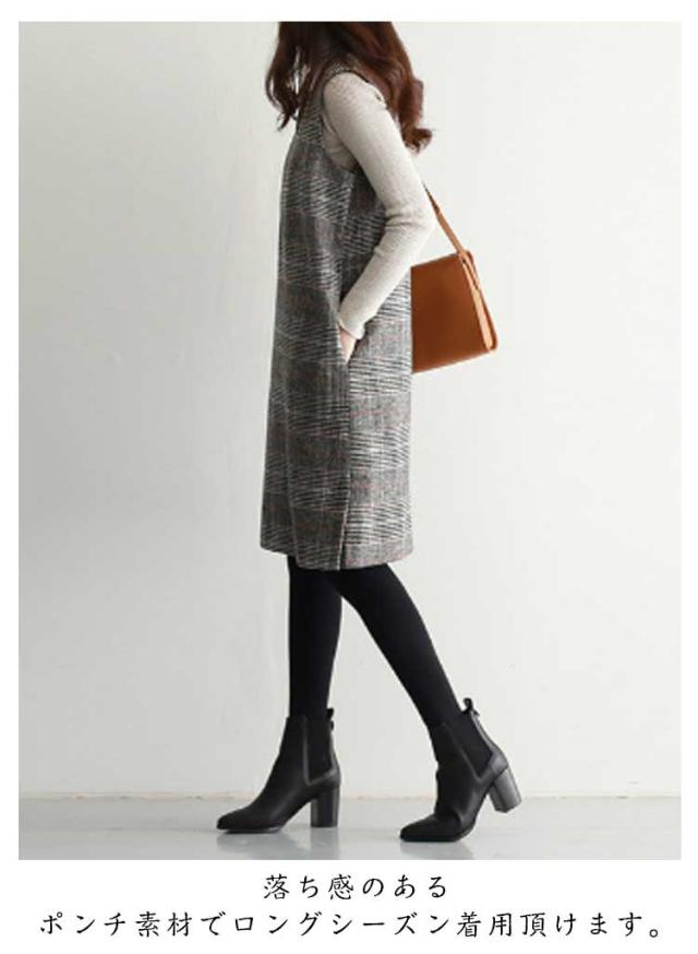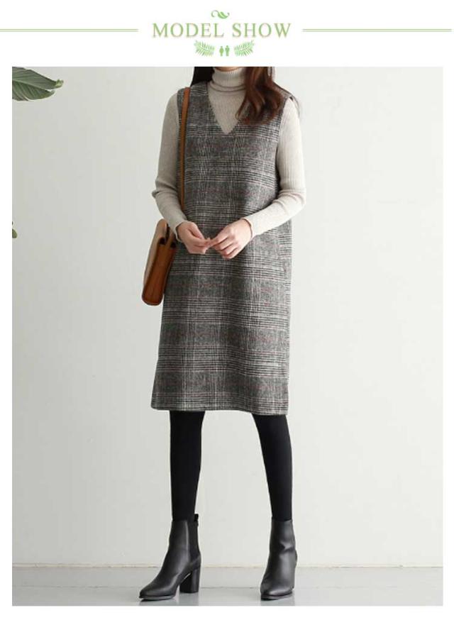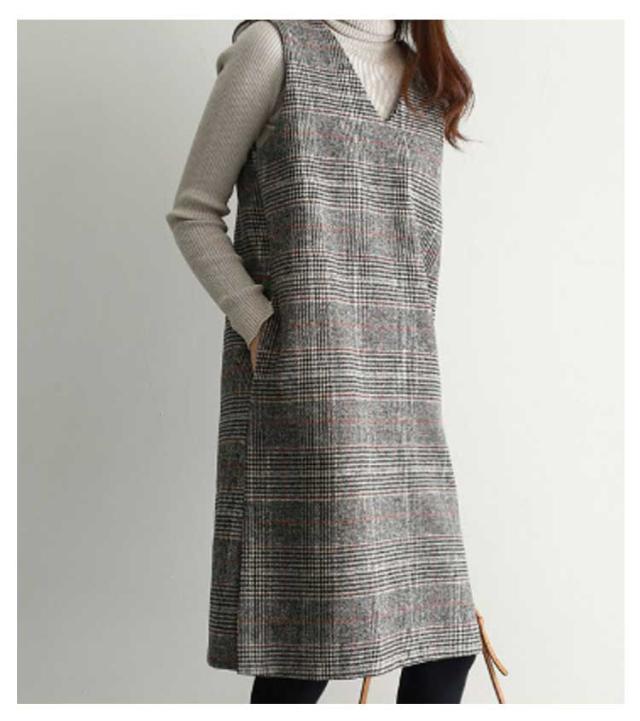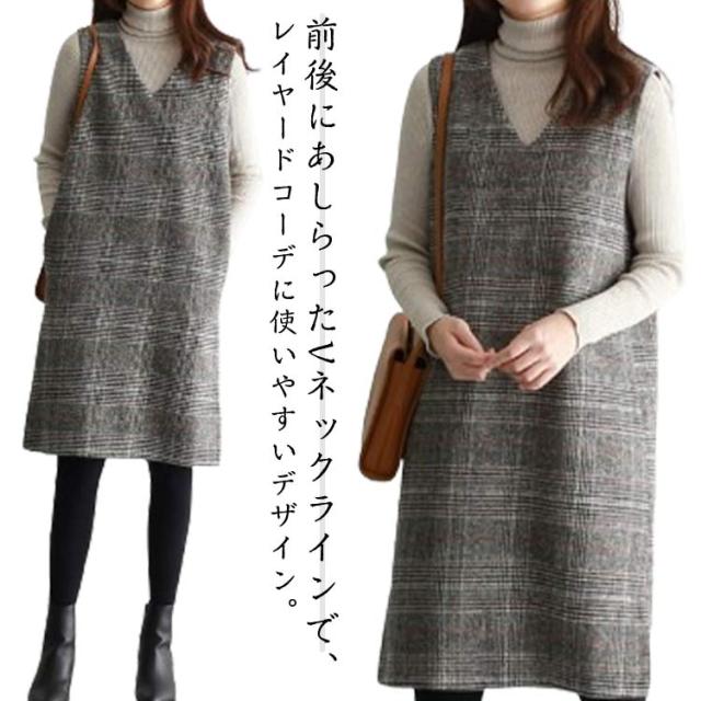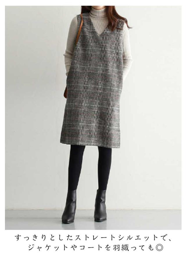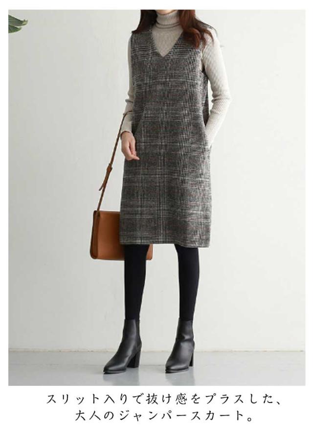 ワンピース グレンチェック 春 オフィス 秋 ラウンドネック スリット入り 大人 ミディアム ワンピ ジャンパースカート きれいめ オフィスカジュアル ジャンパースカート きれいめ Vネック カジュアル フォーマル 体型カバー オフェス 通学 グレンチェック