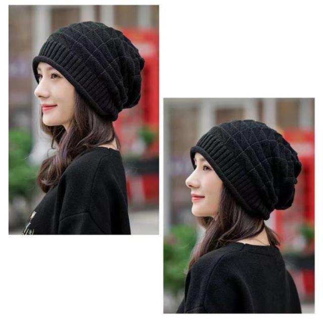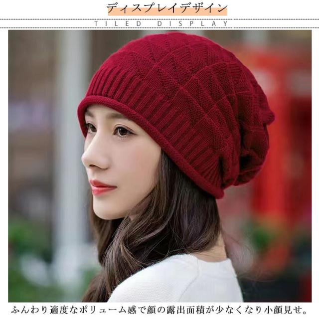 | 浅く被ってルーズに、深く被って耳まで防寒など被り方を変えてアレンジが出来る。 ふんわり適度なポリューム感で顔の露出面積が少なくなり小顔見せ。 伸縮性があり頭の形に優しくフィット締め付け感が少なくストレスフリー。 チクチクしにくい優しい肌触り。 | |