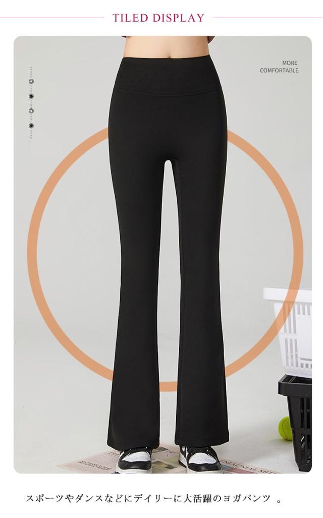 | シンプルにTシャツと合わせてカジュアルコーデを楽しんだり、スポーツ時にご着用したり様々なシーンで活躍間違いなし。 スポーツやダンスなどにデイリーに大活躍のヨガパンツ 。 フレアシルエットで美脚&脚長効果抜群、ウエストラインも美しく見せてくれます。 柔らかいナイロン素材を使い、ストレッチ性で着やすく、他のアイテムとの組み合わせも相性抜群です。 膝上で絞った細身ラインと膝下より広がるシルエットのデザインで、足元を華奢に見せます。 | |