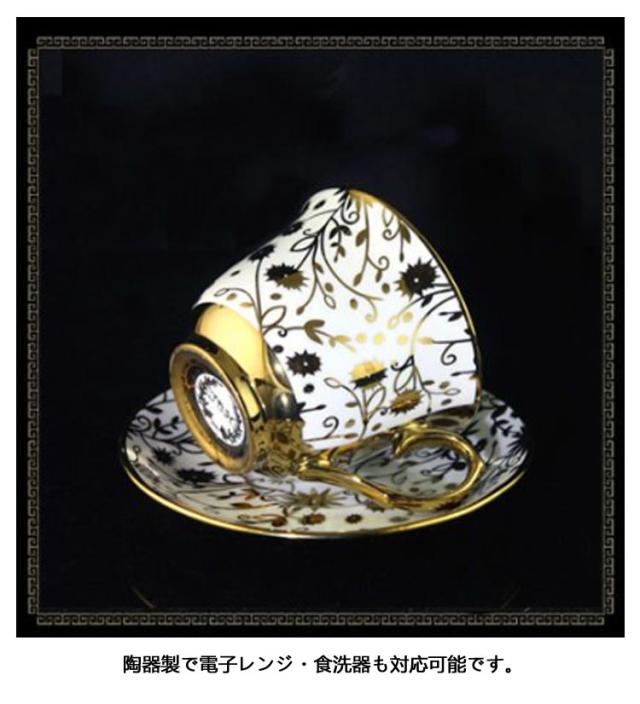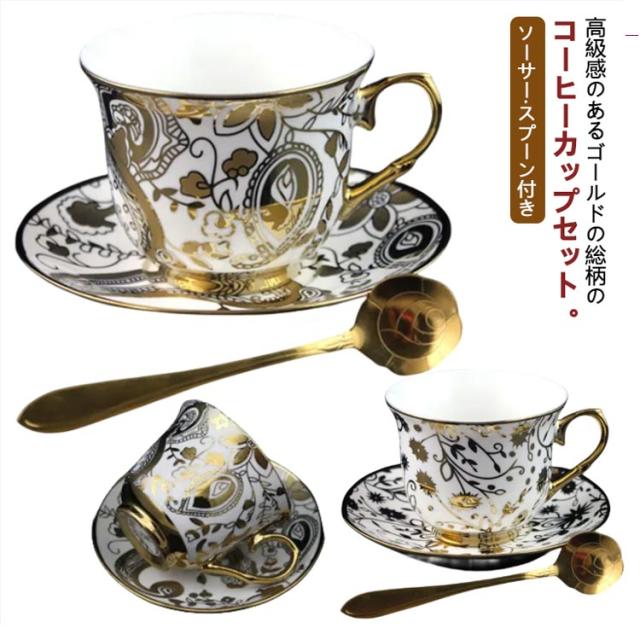 | 高級感のあるゴールドの総柄のコーヒーカップセット。【ソーサー?スプーン付き】 容量約220ml、コーヒーやお茶を楽しむのにちょうど良い大きさのマグカップが入荷しました。 毎日のお茶の時間をゆっくりと過ごして頂きたい、カップ&ソーサー。 日本茶だけでなく、紅茶やコーヒーにもおすすめです。 陶器製で電子レンジ・食洗器も対応可能です。 ご自身用にはもちろん、ギフトにもおすすめです。 | |