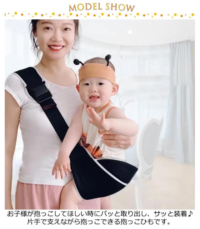 | 5ヶ月〜4歳対応 パパもママ兼用で愛用できるシンプルで使い勝手の良いベビースリング お子様が抱っこしてほしい時にパッと取り出し、サッと装着♪片手で支えながら抱っこできる抱っこひもです。 【ママパパの負担を軽減/お子様への安心を考えた構造】荷重がかかる親御さんの肩部分は、肩全体に負荷が分散するおうぎ形ショルダーパッドを採用。 お子様のお尻部分には、しっかりとお尻を支える幅広ヒップシートを採用。 【ママパパ兼用モデル】長さを調節できるベルトがついているため、体格に合わせて調節できます。 電車やバスなどの移動時や、お買い物、お散歩、旅行など、さまざまなシーンでお使い頂けます | |