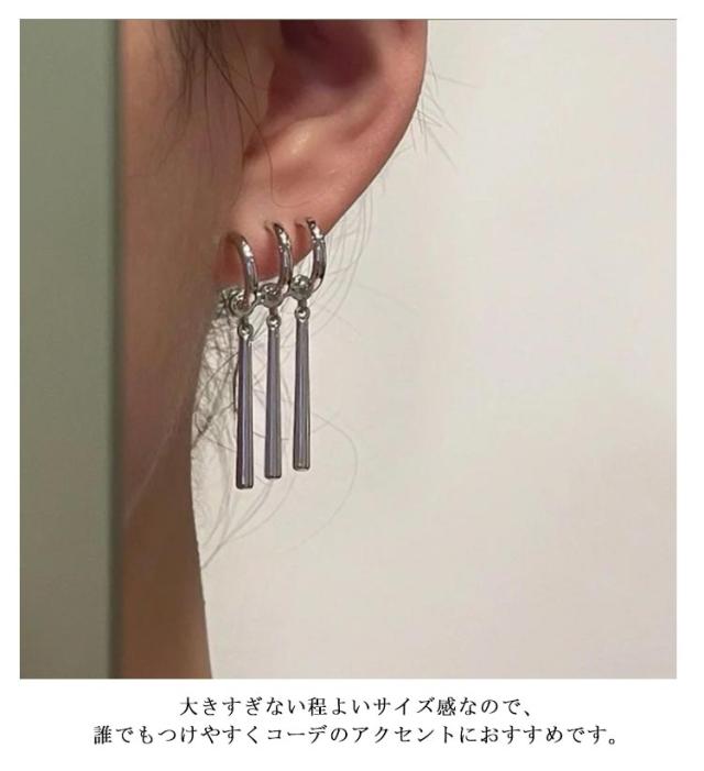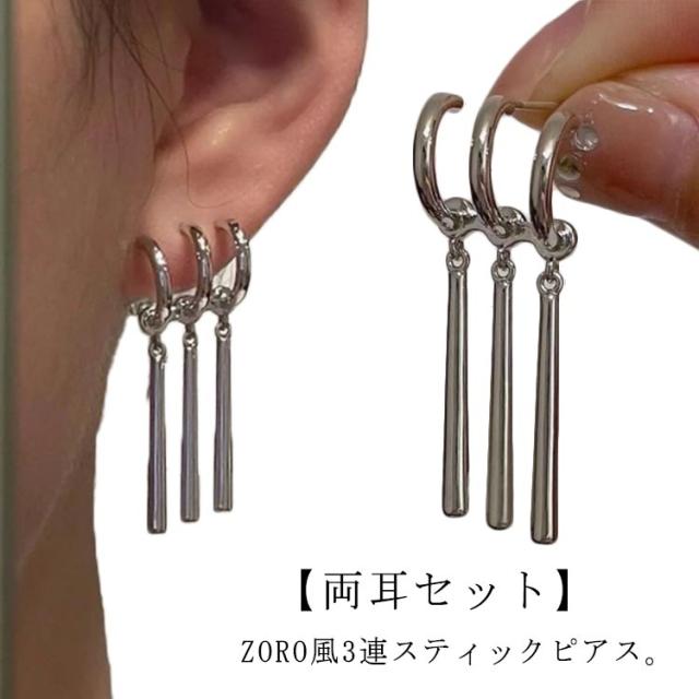 | ZORO風3連スティックピアス。【両耳セット】 動くたびに揺れるスティックモチーフはデザイン性が高く目を惹きます。 大きすぎない程よいサイズ感なので、誰でもつけやすくコーデのアクセントにおすすめです。 シングルピアスとして片耳だけにつけたり、両耳につけたりその日の気分で使い分けできます。 素材はチタンで変色や錆びに強く、アレルギー反応が出にくい点が特徴です。また、硬い金属ですのでお手入れも簡単で、一年中安心してご使用していただけるアクセサリー素材です。 カップルやお友達同士でシェアすると更にお得です。 シンプルなフープピアスはメンズにもレディースにもおススメです。 | |