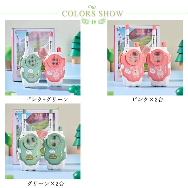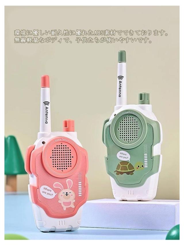 | デザインは可愛いく、操作も簡単!最新型の子供用トランシーバー。 2台セットですので購入後すぐに交信可能です。2台トランシーバー最大の伝送距離は約500mです。 環境に優しい耐久性に優れたABS素材でできております。無線軽量なボディで、子供たちが使いやすいです。 屋外の公園など遊ぶ時に子供は互いに離れても声が聞こえでき、とても便利です。 はっきりと聞こえる音質があり、音量調節もでき、子供の耳を傷つけませんながら、聴力も鍛えます。 | |