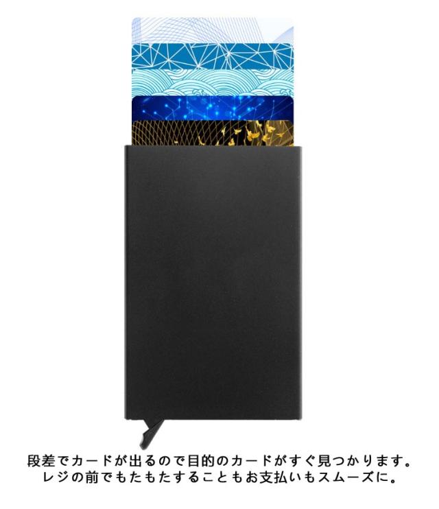 | キャッシュレス時代に対応する次世代スマートウォレットです。レバーを下へスライドすることで一瞬でカードを取り出すことができます。階段式に取り出せる為、使いたいカードが一目でわかります。仕事やプライベートを、もっとスマートに演出してくれます。 あなたの大切なカードを守るため、磁気不良防止機能付き、耐衝撃性、スキミング防止機能付き。カードを多用する現代において、もっとも大切な機能です。 カードで分厚くなってしまったお財布もこれ1つですっきり収納。さらに取り出しも1プッシュ。段差でカードが出るので目的のカードがすぐ見つかります。レジの前でもたもたすることもお支払いもスムーズに。 | |