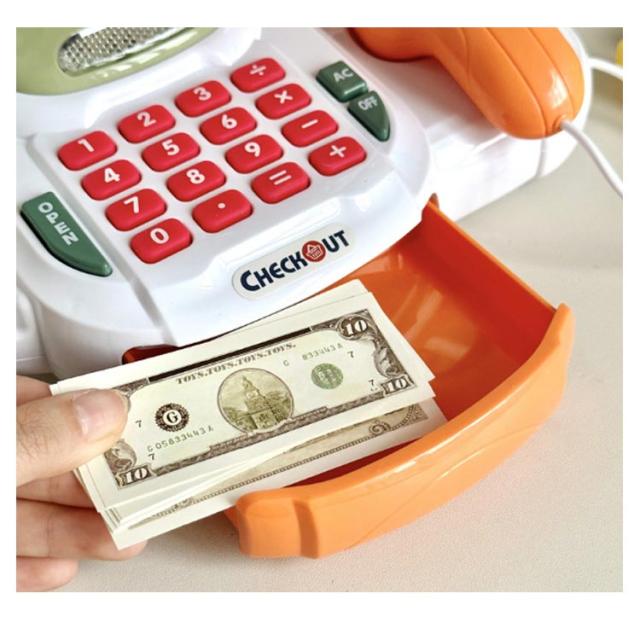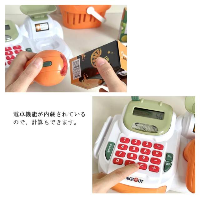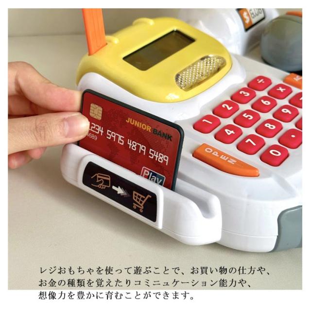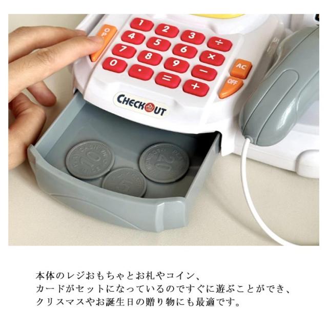 | ・お店屋さんごっこが楽しくなっちゃう本物そっくりのレが登場! ・本体のレジおもちゃとお札やコイン、カードがセットになっているのですぐに遊ぶことができ、クリスマスやお誕生日の贈り物にも最適です。 ・レジおもちゃを使って遊ぶことで、お買い物の仕方や、お金の種類を覚えたりコミニュケーション能力や、想像力を豊かに育むことができます。 ・スキャナーをものに押しあてると音が鳴ります。 ・電卓機能が内蔵されているので、計算もできます。 | |