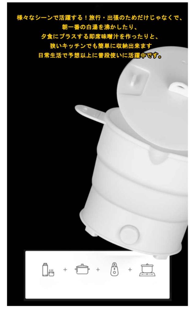 | シンプル折り畳み電気鍋。湯沸かし・鍋料理など、ひとつの鍋でマルチに活用! コンパクト!収納場所に困りません。カバンに入れて旅行にも持ち運びできます。 様々なシーンで活躍する!旅行・出張のためだけじゃなくで、朝一番の白湯を沸かしたり、夕食にプラスする即席味噌汁を作ったりと、狭いキッチンでも簡単に収納出来ます日常生活で予想以上に普段使いに活躍中です。 | |