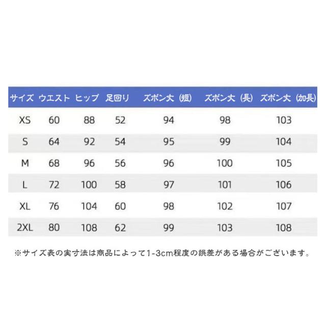 | サイズについての説明 | XS:ウェスト60cm ヒップ88cm 太もも回り52cm ズボン丈98cm S:ウェスト64cm ヒップ92cm 太もも回り54cm ズボン丈99cm M:ウェスト68cm ヒップ96cm 太もも回り56cm ズボン丈100cm L:ウェスト72cm ヒップ100cm 太もも回り58cm ズボン丈101cm XL:ウェスト76cm ヒップ104cm 太もも回り60cm ズボン丈102cm 2XL:ウェスト80cm ヒップ108cm 太もも回り62cm ズボン丈103cm 3XL:ウェスト84cm ヒップ112cm 太もも回り64cm ズボン丈104cm ※サイズ表の実寸法は商品によって1-3cm程度の誤差がある場合がございます。 |