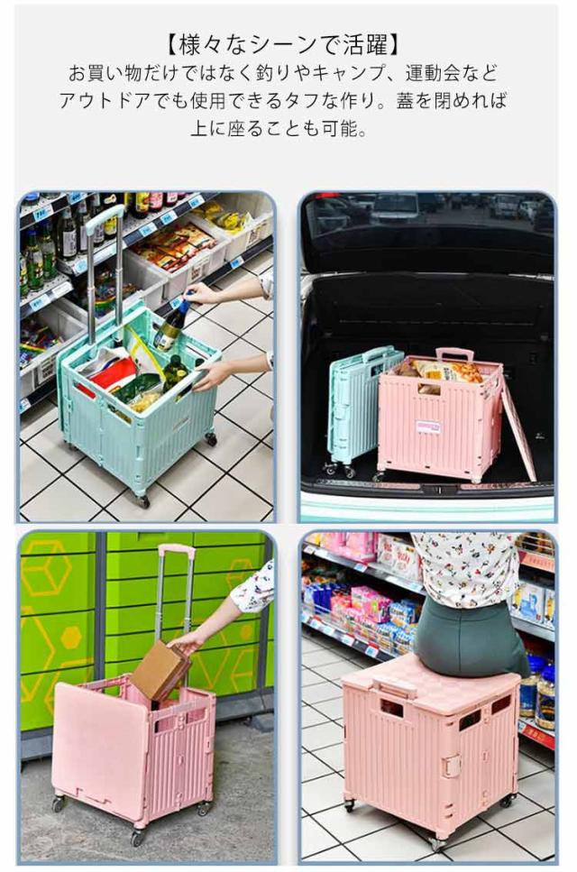 買い物 エコバッグ 大容量 キャリーカート 4輪 フタ付き 70L ショッピングカート 折りたたみ カート 買い物カート 軽量 蓋付き ふた付き コンテナキャリー コンテナ 静音 台車 座れる アウトドア 飛び出し防止 キャンプ レジャー 運動会 コンパクト 車載 便利