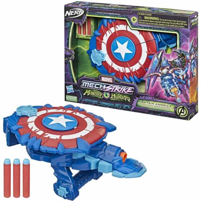 マーベル メック ストライク モンスター ハンター キャプテン アメリカ モンスター ブラスト シールドには NERF ダーツ 3 本が付属します (追加のダーツは別売りです。)