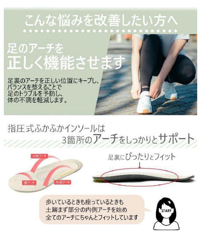 体の不調の原因となる「アーチ崩れ」も、このインソールでは足裏のアーチを 正しい位置にキープし、バランスを整えることで足のトラブルを予防し、体の不調を軽減します。