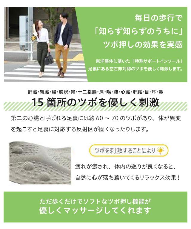 東洋医学に基づいた「特殊インソール」。柔らかい硬度と足なり設計で足裏にある左右非対称の15箇所 のツボを優しく刺激します。