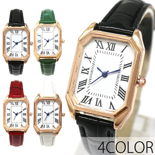 レクタンギュラーオクタゴンケース ゴールドケース ローマ数字インデックス 青針 PUレザーベルト SPST054 レディース腕時計 送料無料