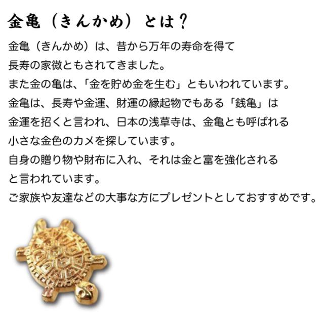 | 商品紹介 | 金亀(きんかめ)は、昔から万年の寿命を得て長寿の家微ともされてきました。 また金の亀は、「金を貯め金を生む」ともいわれています。 金亀は、長寿や金運、財運の縁起物でもある「銭亀」は金運を招くと言われ、 日本の浅草寺は、金亀とも呼ばれる小さな金色のカメを探しています。 自身の贈り物や財布に入れ、それは金と富を強化されると言われています。 幸運と財運を招く、健康と長寿、財産は大いに改善されます。 また、小金亀は成功を教えてくれるともされています。 ご家族や友達などの大事な方にプレゼントとしておすすめです。 |