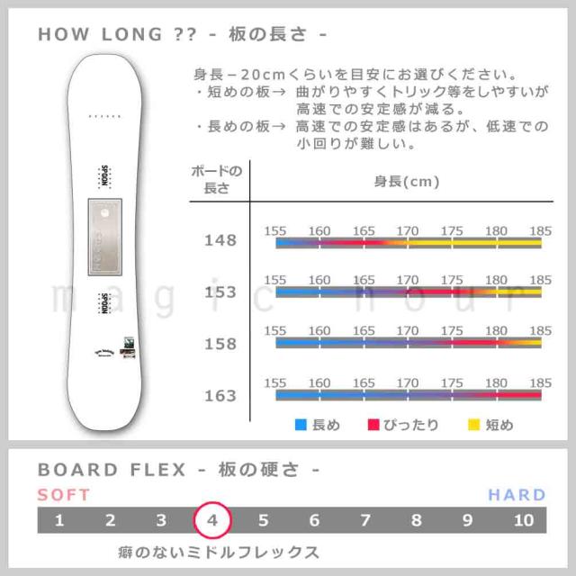 サイズ選びのポイント ボードサイズ…女性 身長マイナス15cm前後がおすすめ! 153cmの方→138くらいの板 157cm方→142くらいの板 顎から鼻辺りまでの長さが一般的に乗りやすい長さになっています。 |