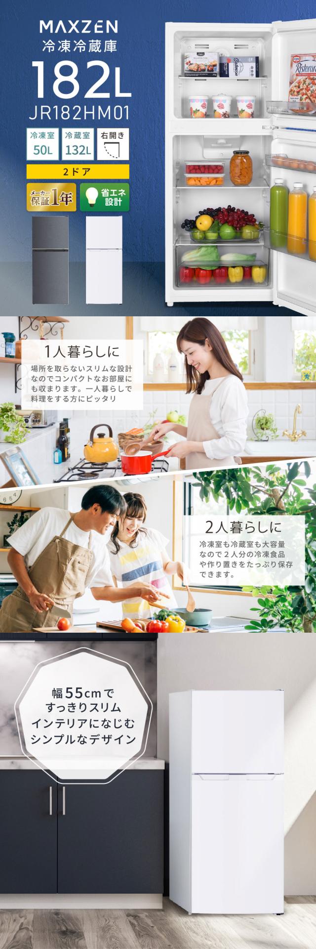 冷蔵庫 182L 自動霜取り 大容量 コンパクト 右開き 2ドア 幅55cm 一人暮らし 二人暮らし 冷凍室上側 温度調節 耐熱板 省スペース 黒 グレー JR182HM01 マクスゼン