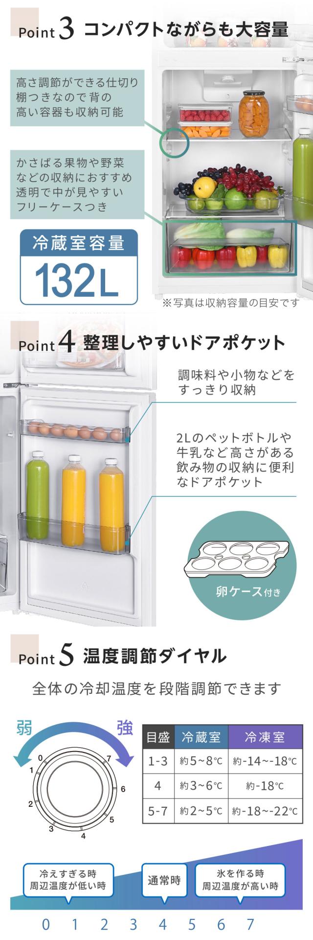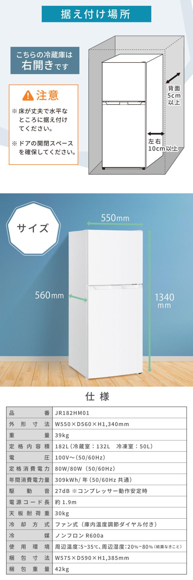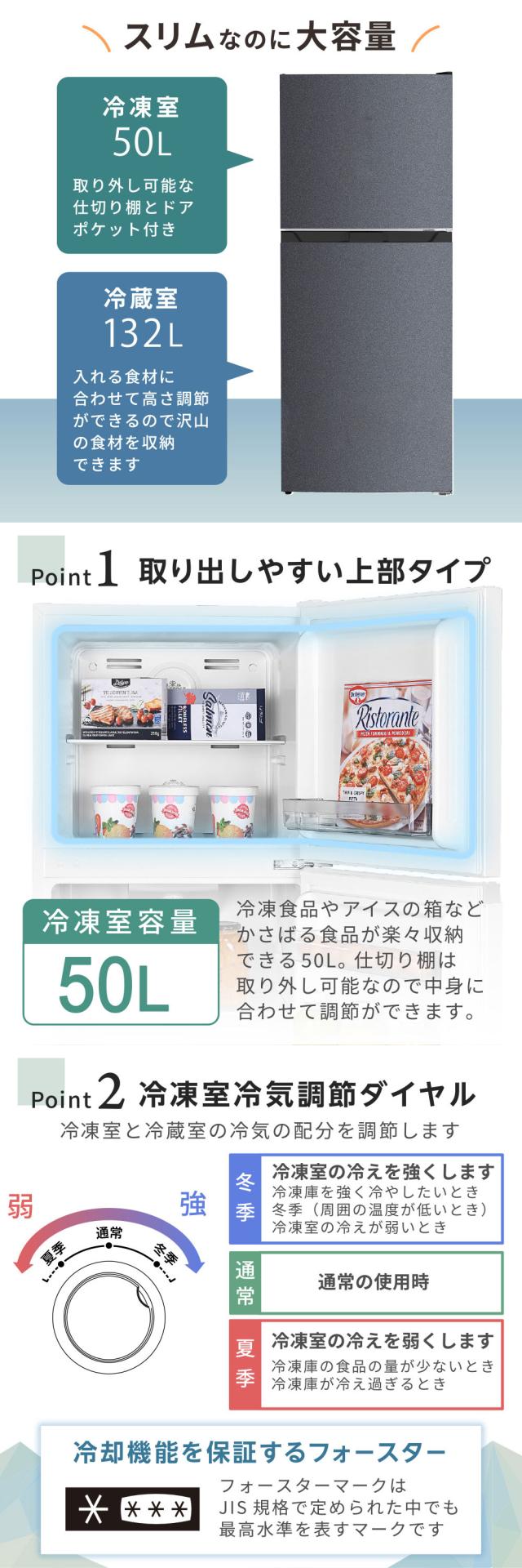 * 定格内容積:182L(冷蔵室:132L 冷凍室:50L)