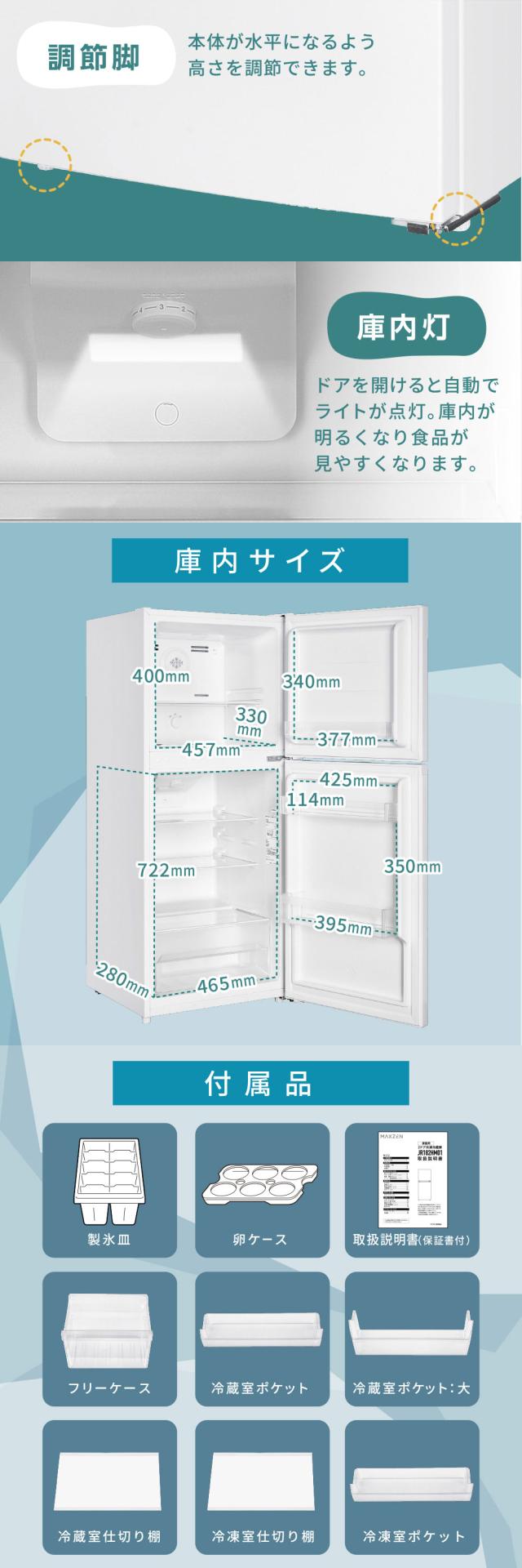 * 付属品:製氷皿、卵ケース、取扱説明書(保証書付)、フリーケース、冷蔵室ポケット、冷蔵室ポケット:大、冷蔵室仕切り棚、冷凍室仕切り棚、冷凍室ポケット