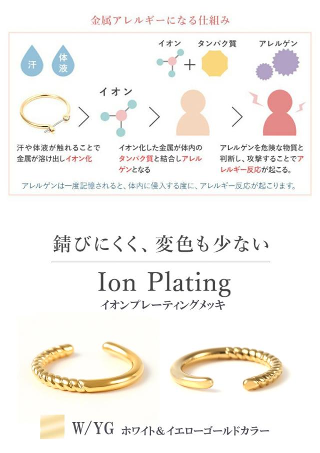「 金属アレルギー 」を起こしにくいチタン素材の「 IonPlating ( イオンプレーティング )メッキ 」を採用。通常のコーティングと比べ、半分以下の薄さで5倍以上の強度を保ちます。さらに密着性にも優れ、剥がれにくいのも特徴。お肌に優しく安心です。「 セカンドピアス 」としてもおすすめ!