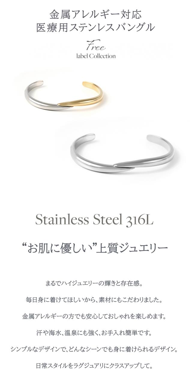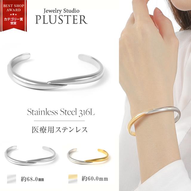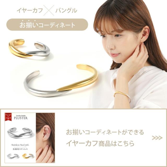 「 バングル 」× ジュエリー感のある洗練された質感シルエットと輝きの美しいエレガントなバングル。女性の手首を華奢に細く見せてくれます。シンプルなデザインで、重ね付けにもおすすめです。「 ステンレス 316L 」は金属アレルギー対応で、お肌に優しく安心です。