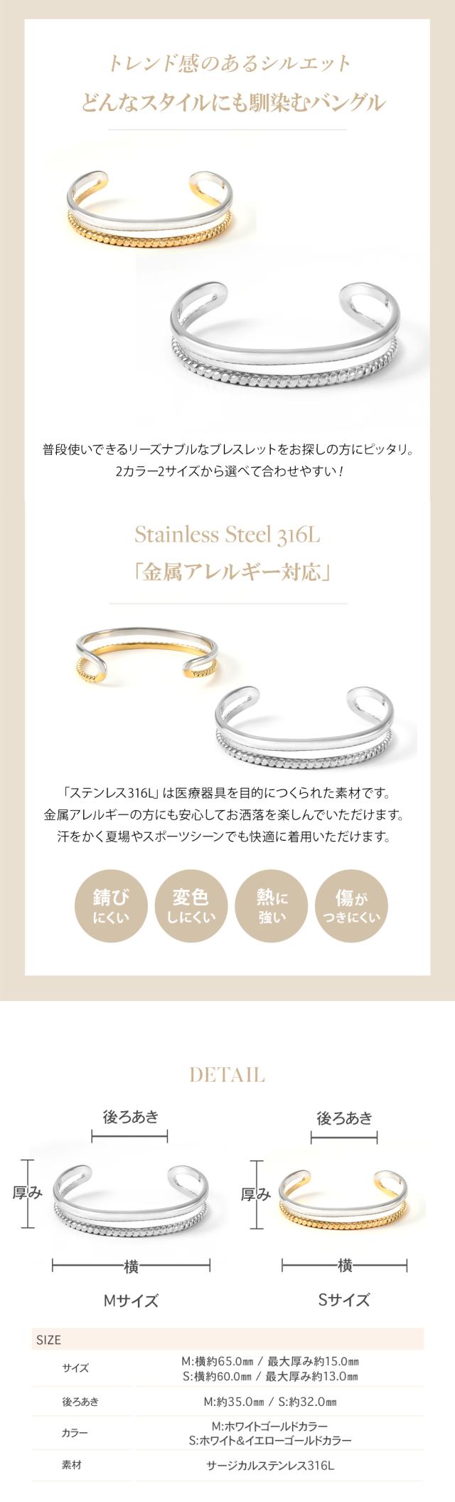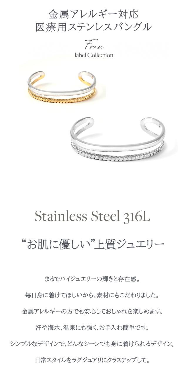 「 バングル 」× ジュエリー感のある洗練された質感シルエットと輝きの美しいエレガントなバングル。女性の手首を華奢に細く見せてくれます。シンプルなデザインで、重ね付けにもおすすめです。「 ステンレス 316L 」は金属アレルギー対応で、お肌に優しく安心です。