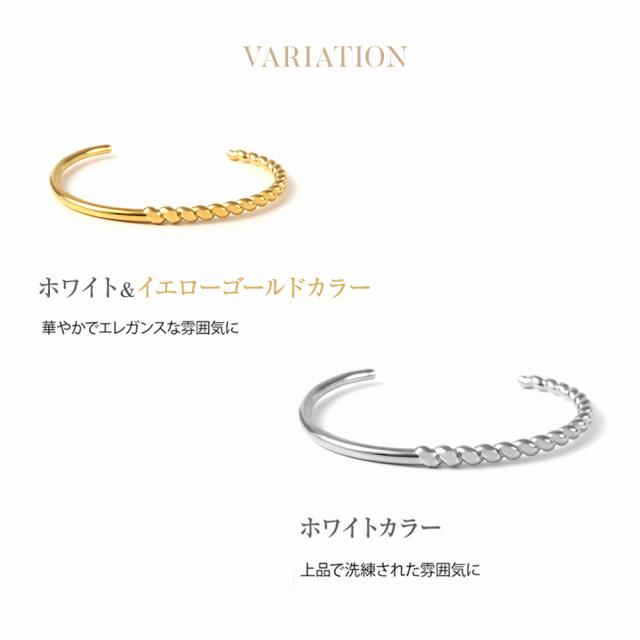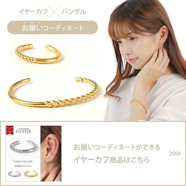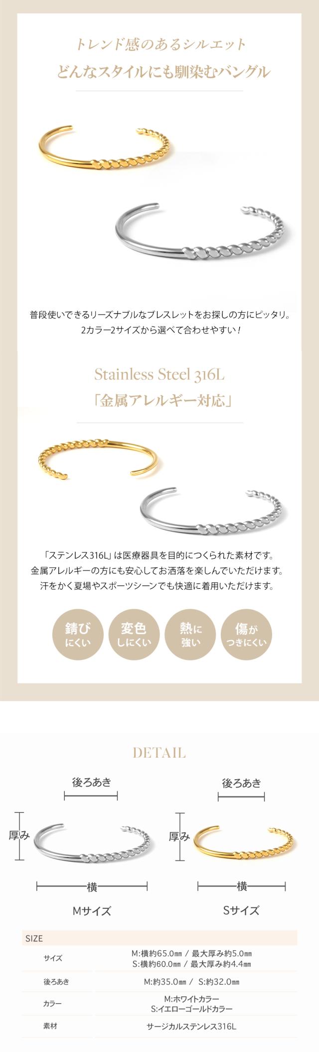「 バングル 」× ジュエリー感のある洗練された質感シルエットと輝きの美しいエレガントなバングル。女性の手首を華奢に細く見せてくれます。シンプルなデザインで、重ね付けにもおすすめです。「 ステンレス 316L 」は金属アレルギー対応で、お肌に優しく安心です。