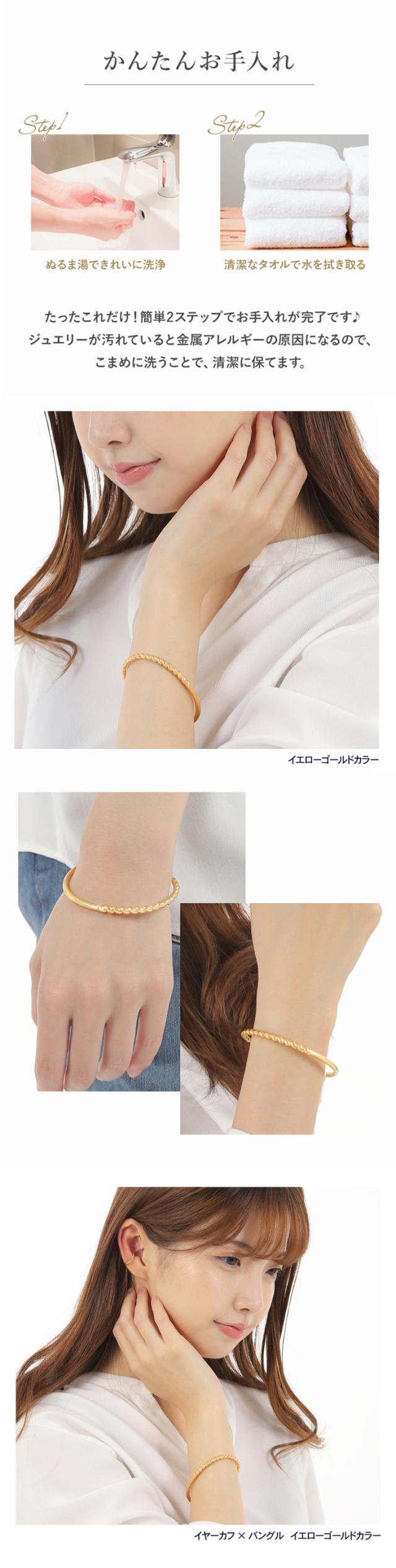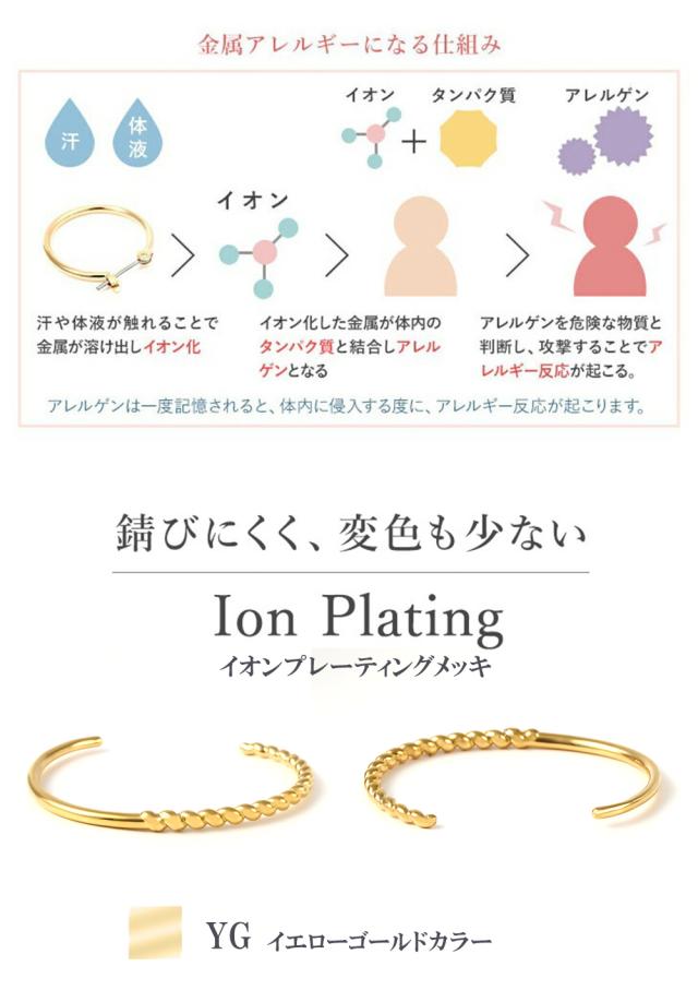「ステンレス316L」は、”錆びにくく変色も少ない”という特徴があります。そのため、汗などに接触しても金属が溶け出しにくく、アレルギー反応を起こしにくいので、近年金属アレルギー対応のジュエリー素材として使用されています。アレルギーの方でも安心・安全にオシャレを楽しんでいただきたいからこそ、素材にこだわりました。