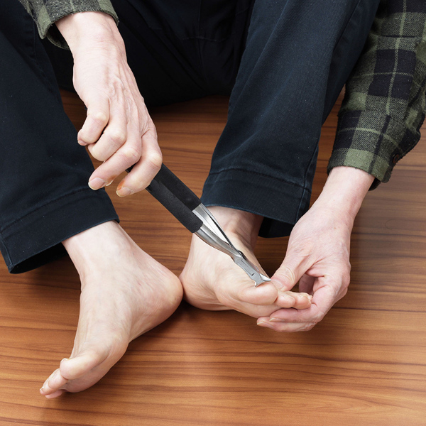 足の爪先までラクラク届く!前屈要らずのロング爪切り。■足の爪切りは腰やひざに負担がかかる前屈が必要で、ついつい億劫になりがち。本品は、持ち手が長いニッパー式なのでかがまずに足の指先までラクラク届く仕様!■テコの原理を利用した構造なので力は要らず!ダブルスプリング仕様なので切った後は勝手に広がります。■鋭い刃先は爪がスパスパ切れてノーストレス!切った後は付属の爪砥ぎやすりで滑らかに仕上げることができます。■滑りにくく持ちやすいシリコン製グリップ。