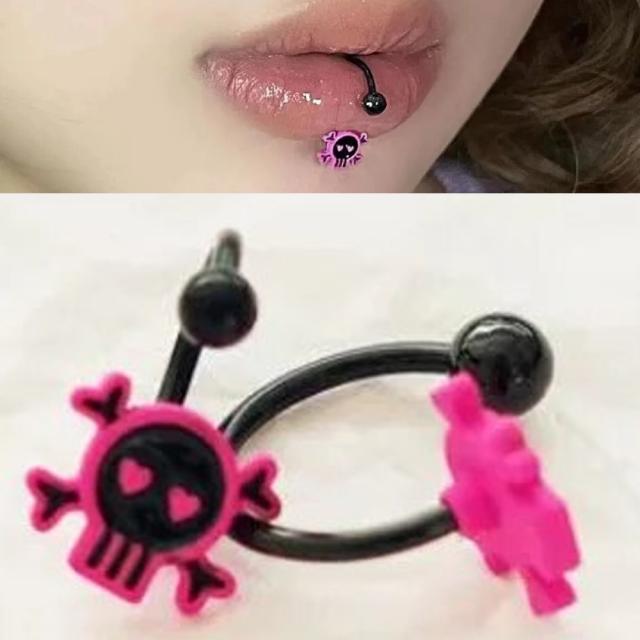 [16G ボディピアス ] ピンクスカルリップフープブラックサーキュラーバーベル 16ga 16ゲージ メンズ レディース ドクロ がい骨 骸骨 髑髏 ガイコツ サージカルステンレス316 口ピアス クチ リップ くちびる クチピアス サーキュラー型 リップループ ネジ 唇ピアス 黒色