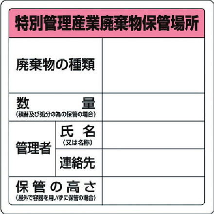 ●摘要:裏面糊付●内容:特別管理産業廃棄物保管場所●寸法(mm):600×600×0.35厚