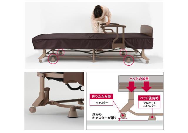 使用時は自動ロックで安心、折りたたみ時はキャスターで簡単に移動。アテックス独自技術の“フルオートストッパー”機能で、より安全で快適に。体をしっかり支える硬めの多層構造マットレス