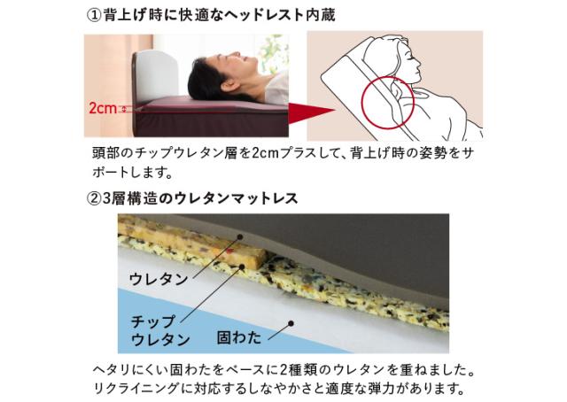 寝心地と動きやすさ(寝返り)を考慮した3層構造のマットレスです。頭部はチップウレタン層の厚みを2cmプラスして、背上げ時の姿勢をサポートします。マットレス分離タイプ