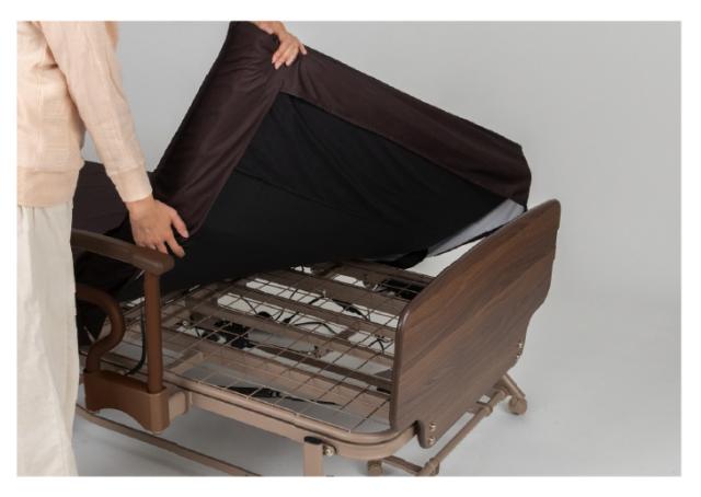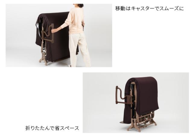 ベッドの真ん中のアシストグリップを上に持ち上げて折りたためます。移動はキャスターで手軽に行えるので、来客時や移動ベッド下のお掃除にも便利です。フレームを隠すマットカバー