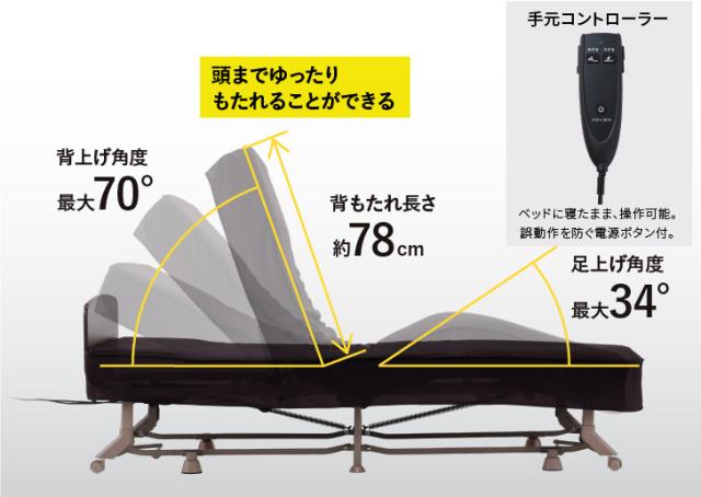 手元のコントローラーを使えば、寝たまま背もたれの角度が調節できます。起き上がりの補助はもちろん、ベッドの上で読書やテレビ鑑賞など、シーンに合わせて起き上がりの角度を調節できます。