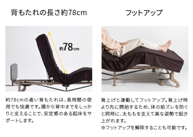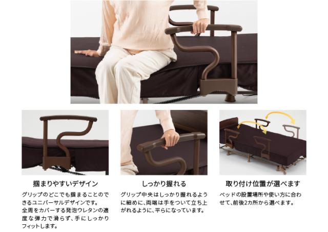 腰から起き上がり、頭を支えながらゆったりと起き上がり、背上げと連動してフットアップ。背上げ時より先に開始するため、身体の前ズレを防ぐと同時に、太ももを支えて楽な姿勢で起き上がれます。※フットアップを解除することも可能です。ベッドの乗り降りがしやすいサイドグリップを付属
