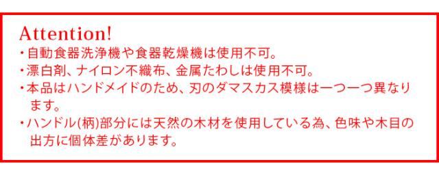 | 自動食器洗浄機や食器乾燥機は使用不可。 漂白剤、ナイロン不織布、金属たわしは使用不可。 本品はハンドメイドのため、刃のダマスカス模様は一つ一つ異なります。 ハンドル(柄)部分には天然の木材を使用している為、色味や木目の出方に個体差があります。 |