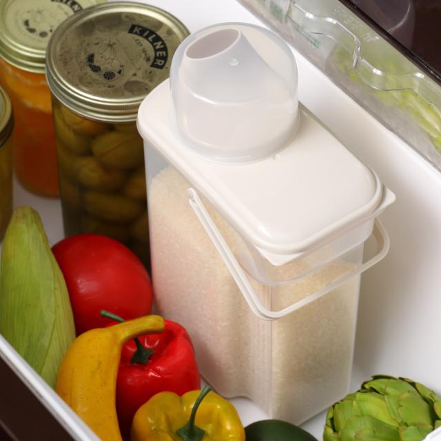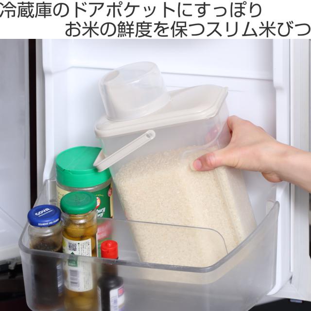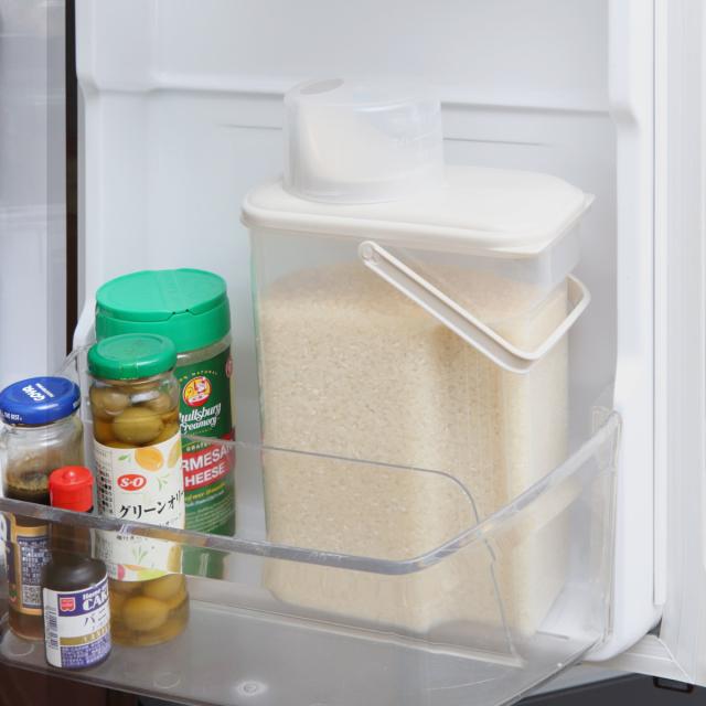 スリムタイプでドアポケットにも入る。冷蔵庫保存に便利な米びつ