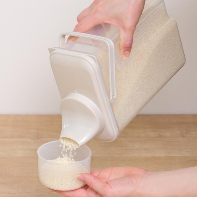 冷蔵庫のドアポケットにスッポリ入るスリムサイズな米びつです。フタが計量カップになっていて、冷蔵庫から取り出してフタを開ければすぐに計量できる手軽さ。少しずつ精米して食べる方にもおすすめです。