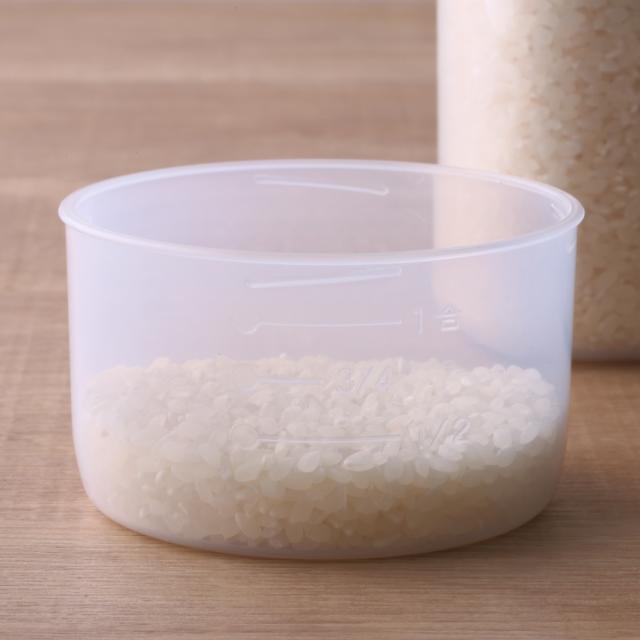 フタは目盛りがついているので、冷蔵庫から取り出してフタを開ければすぐに計量できます。また、普通米だけでなく無洗米も計量が可能です。