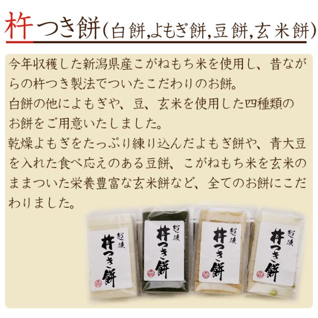 魚沼産黄金もち:水稲もち米(新潟県魚沼産こがねもち) 紅穂糯:水稲もち米(新潟県産しめはり糯) 杵つき白餅:水稲もち米(新潟県産こがね糯) 杵つきよもぎ餅:水稲もち米(新潟県産こがね糯),蓬 杵つき豆餅:水稲もち米(新潟県産こがね糯),青大豆,食塩 玄米餅:水稲もち米(新潟県産こがね糯) |