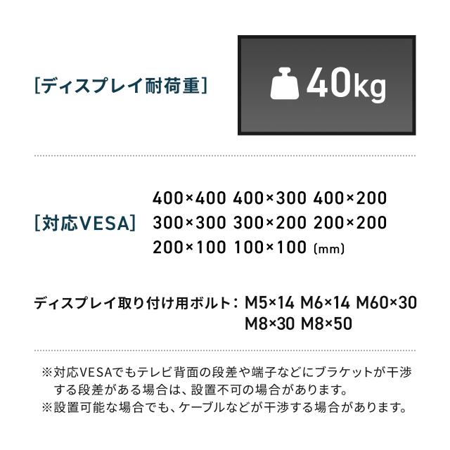 ■対応サイズ・VESA:100×100、100×200、200×100、200×200搭載で、15kgまで55インチまでのディスプレイ・モニター
