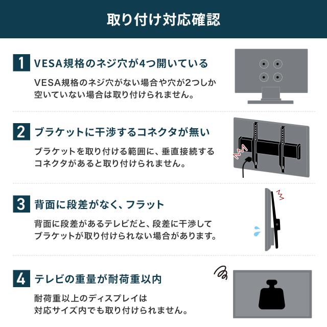 ※対応VESAでも、テレビ背面に設置ブラケットに干渉する段差がある場合は、設置不可の場合がございます。