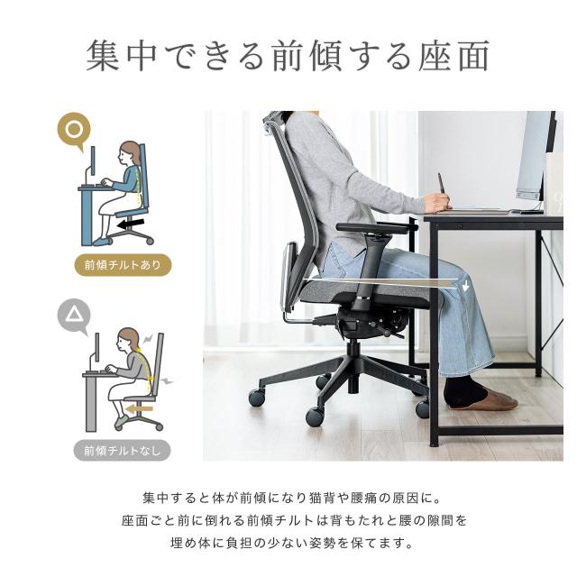 ⇒ご購入の前にご確認下さい背もたれが非常にスリムな構造のメッシュチェア。背もたれを引き上げるだけで簡単に5段階で上下調節可能。最適なシートポジションを維持することができるスライド式座面。集中力を高めることが出来る前傾機能。4Dアームレスト搭載。耐荷重100kgの高耐荷重仕様。シンクロッキング仕様。3段階階度調節可能ロッキング固定。モールドウレタン。ウレタンキャスター採用。【WEB限定商品】