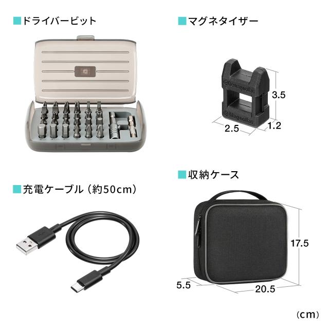 ■セット内容:本体、充電ケーブル(USB Aコネクタ-タイプCコネクタ)、マグネタイザー、ビットケース(ドライバビット30種、延長アダプタ、シャンク径4mm変換アダプタ)、収納ケース