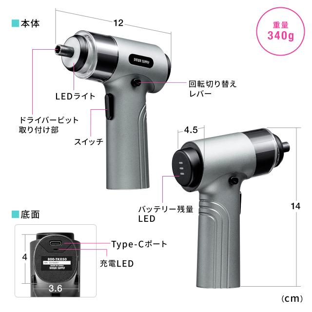 電動ドライバー コードレス 小型 LED付き 充電式 Type-Cコネクタ 正逆転切替 2500mAh ケース付き[800-TK050]