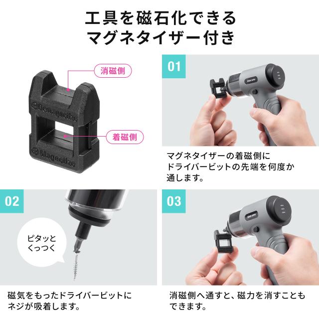 ●ドライバーやヘックスレンチなどに、簡単に着磁と脱磁ができる、便利なマグネタイザー付きです。