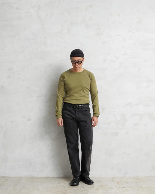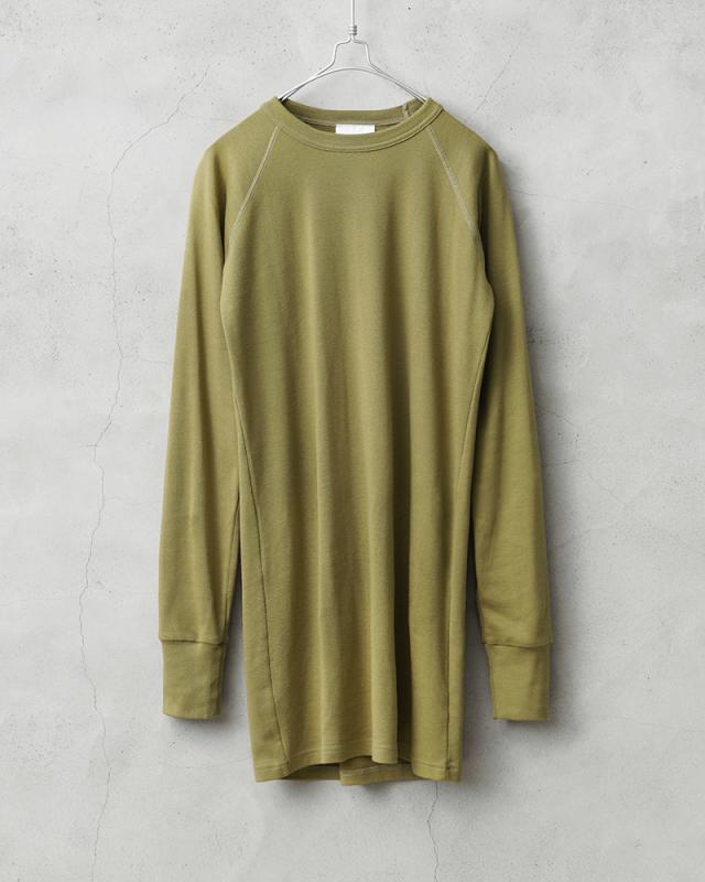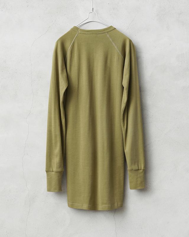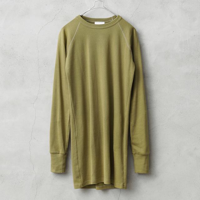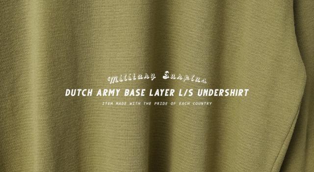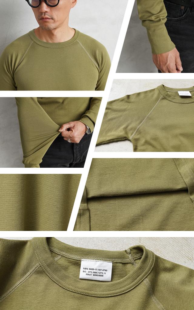 オランダ軍で1990年〜2000年代にかけて製造されていたベースレイヤーL/S Tシャツで、コットン95%とゴムのような弾性を持つエラストマー5%の混紡素材が使用されており、縦横への伸縮性に優れた素材感で、裏地には凹凸があり、肌に触れる面積が少なく通気性も良く快適にフィットする編地です。首回りから斜めに縫い付けられたラグランスリーブ仕様なので肩や腕が動かしやすく作られています。カバーステッチで縫い目にストレスのない快適な着心地で縫製にもこだわりを感じさせます。