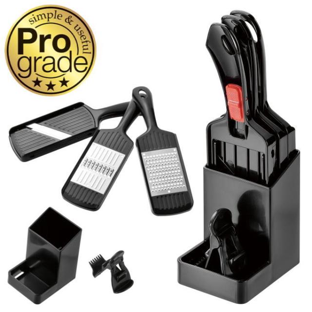 | 3種類の調理がこれひとつでできる。 スタンド収納で場所を取らずサッと取り出せる スライサー・千切り・薬味おろし・ホルダー付き |