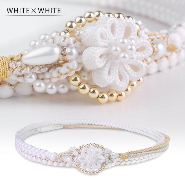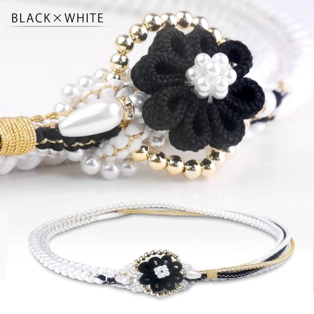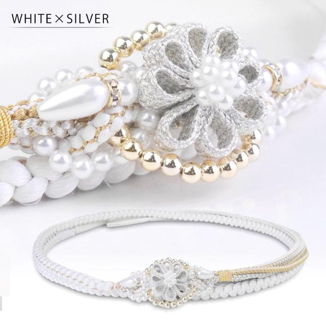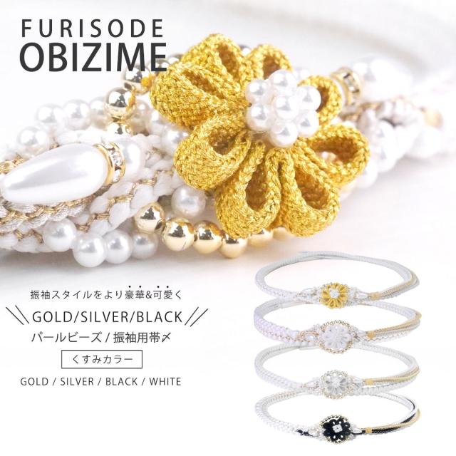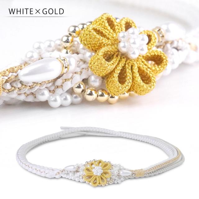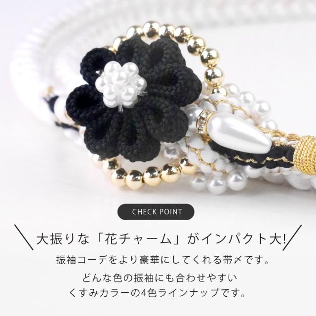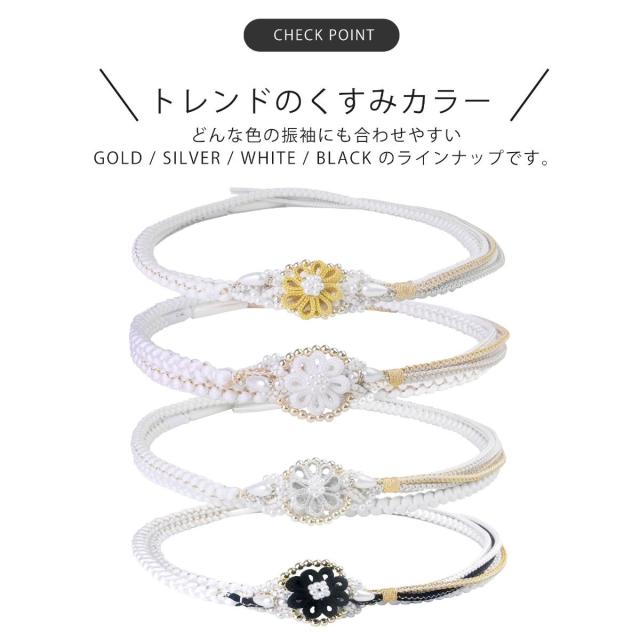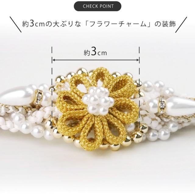 振袖用 パール ビーズ 帯締め 帯〆 ゴールド シルバー くすみカラー 組紐 選べる4色 くみひも 撚り房 カジュアル 和装小物 日本製 レディース着物 帯〆 ハイクラス ゴージャス小物 約3cmのフラワーチャームがインパクト大!