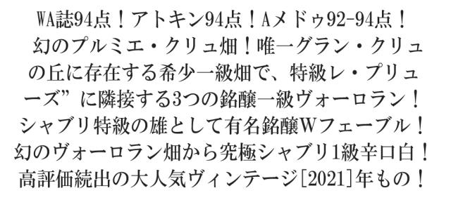 シャブリ プルミエ クリュ ヴォロラン[2021]年 蔵出し品 ドメーヌ ウィリアム フェーヴル元詰 自然派 ビオディナミ 手摘み100%